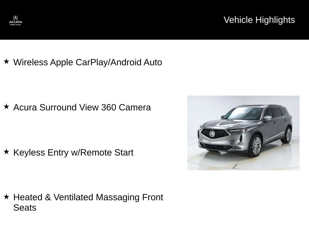 HARPER ACURA believes in the quality of the vehicles we sell so well that we provide an UNLIMITED MILES POWERTRAIN WARRANTY on every new and qualifying pre-owned vehicle it sells!!! This warranty is good at any ASE certified shop in the 48 continental United States!! Check out all these great options Heads-Up Display, Heated & Ventilated Front Sport Seats, Heated rear seats, Heated steering wheel, Navigation system: Acura Navigation System with 3D View, Power Liftgate, Power moonroof, Premium audio system: Acura/ELS Studio 3D, Wheels: 20" x 9" Aluminum Alloy, 16 Speakers, 3rd row seats: split-bench, 4-Wheel Disc Brakes, 4.17 Axle Ratio, A/V remote: CabinControl, ABS brakes, Adaptive suspension, Air Conditioning, Alloy wheels, AM/FM radio: SiriusXM, Anti-whiplash front head restraints, Apple CarPlay/Android Auto, Audio memory, Auto High-beam Headlights, Auto tilt-away steering wheel, Auto-dimming Rear-View mirror, Automatic temperature control, Brake assist, Bumpers: body-color, Compass, Delay-off headlights, Driver door bin, Driver vanity mirror, Dual front impact airbags, Dual front side impact airbags, Electronic Stability Control, Emergency communication system: AcuraLink, Four wheel independent suspension, Front anti-roll bar, Front Bucket Seats, Front Center Armrest, Front dual zone A/C, Front fog lights, Front reading lights, Fully automatic headlights, Garage door transmitter: HomeLink, Heated door mirrors, Heated front seats, HVAC memory, Illuminated entry, Knee airbag, Lane departure: Lane Keeping Assist System (LKAS) active, Leather steering wheel, Low tire pressure warning, Memory seat, Occupant sensing airbag, Outside temperature display, Overhead airbag, Overhead console, Panic alarm, Passenger door bin, Passenger vanity mirror, Perforated Premium Milano Leather Trimmed Seats, Power door mirrors, Power driver seat, Power passenger seat, Power steering, Power windows, Radio data system, Radio: ELS Studio 3D Premium Audio System, Rain sensing wipers, Rear air conditioning, Rear anti-roll bar, Rear reading lights, Rear seat center armrest, Rear window defroster, Rear window wiper, Remote keyless entry, Security system, Speed control, Speed-sensing steering, Speed-Sensitive Wipers, Split folding rear seat, Spoiler, Steering wheel memory, Steering wheel mounted audio controls, Tachometer, Telescoping steering wheel, Tilt steering wheel, Traction control, Trip computer, Turn signal indicator mirrors, Variably intermittent wipers, and Ventilated front seats.
