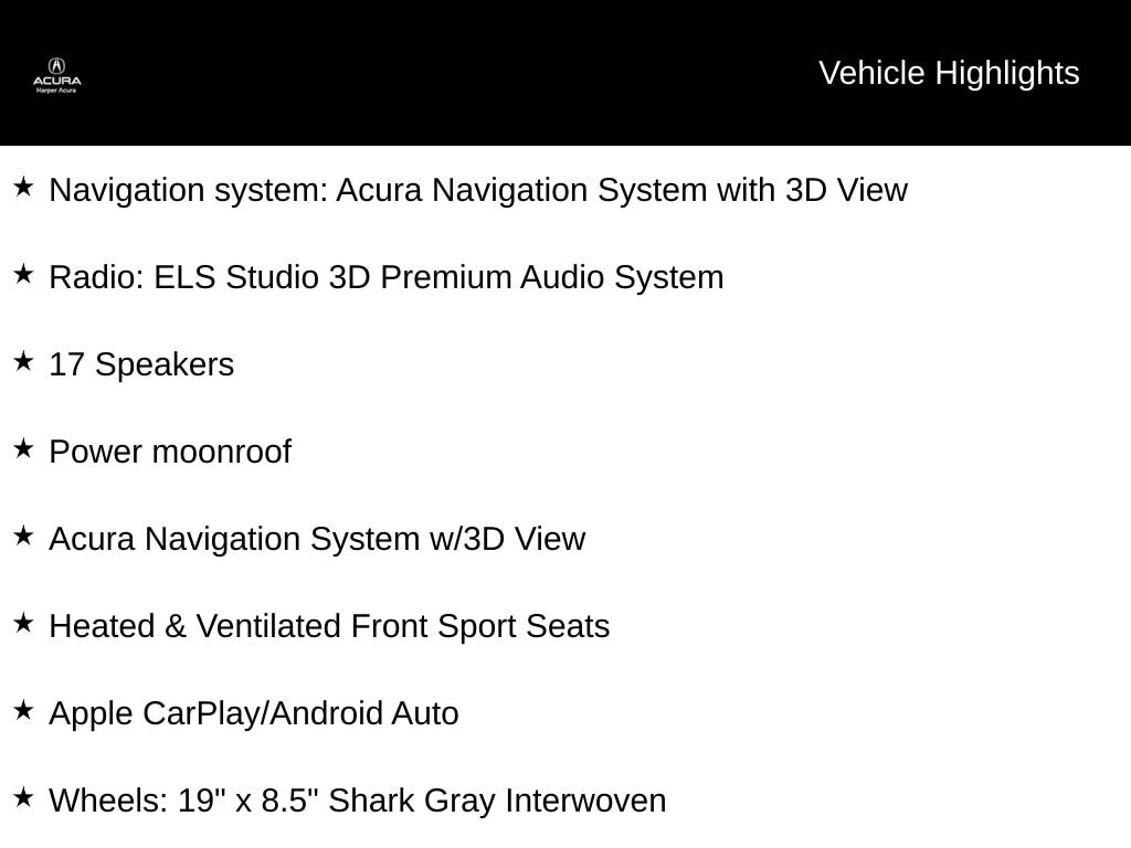 - Navigation system: Acura Navigation System with 3D View