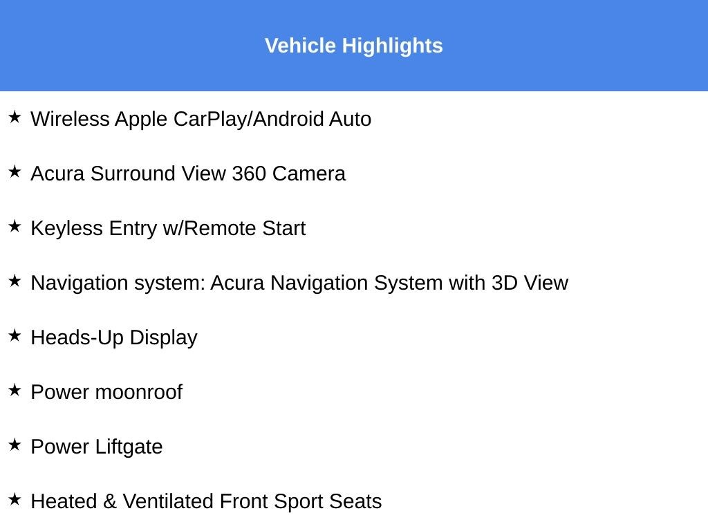 HARPER ACURA believes in the quality of the vehicles we sell so well that we provide an UNLIMITED MILES POWERTRAIN WARRANTY on every new and qualifying pre-owned vehicle it sells!!! This warranty is good at any ASE certified shop in the 48 continental United States!! Check out all these great options Heads-Up Display, Heated & Ventilated Front Sport Seats, Heated rear seats, Heated steering wheel, Navigation system: Acura Navigation System with 3D View, Power Liftgate, Power moonroof, Wheels: 20" x 9" Aluminum Alloy, 16 Speakers, 3rd row seats: split-bench, 4-Wheel Disc Brakes, 4.17 Axle Ratio, A/V remote: CabinControl, ABS brakes, Adaptive suspension, Air Conditioning, Alloy wheels, AM/FM radio: SiriusXM, Anti-whiplash front head restraints, Apple CarPlay/Android Auto, Audio memory, Auto High-beam Headlights, Auto tilt-away steering wheel, Auto-dimming Rear-View mirror, Automatic temperature control, Brake assist, Bumpers: body-color, Compass, Delay-off headlights, Driver door bin, Driver vanity mirror, Dual front impact airbags, Dual front side impact airbags, Electronic Stability Control, Emergency communication system: AcuraLink, Four wheel independent suspension, Front anti-roll bar, Front Bucket Seats, Front Center Armrest, Front dual zone A/C, Front fog lights, Front reading lights, Fully automatic headlights, Garage door transmitter: HomeLink, Heated door mirrors, Heated front seats, HVAC memory, Illuminated entry, Knee airbag, Lane departure: Lane Keeping Assist System (LKAS) active, Leather steering wheel, Low tire pressure warning, Memory seat, Occupant sensing airbag, Outside temperature display, Overhead airbag, Overhead console, Panic alarm, Passenger door bin, Passenger vanity mirror, Perforated Premium Milano Leather Trimmed Seats, Power door mirrors, Power driver seat, Power passenger seat, Power steering, Power windows, Premium audio system: Acura/ELS Studio 3D, Radio data system, Radio: ELS Studio 3D Premium Audio System, Rain sensing wipers, Rear air conditioning, Rear anti-roll bar, Rear reading lights, Rear seat center armrest, Rear window defroster, Rear window wiper, Remote keyless entry, Security system, Speed control, Speed-sensing steering, Speed-Sensitive Wipers, Split folding rear seat, Spoiler, Steering wheel memory, Steering wheel mounted audio controls, Tachometer, Telescoping steering wheel, Tilt steering wheel, Traction control, Trip computer, Turn signal indicator mirrors, Variably intermittent wipers, and Ventilated front seats. New Price! Certified.