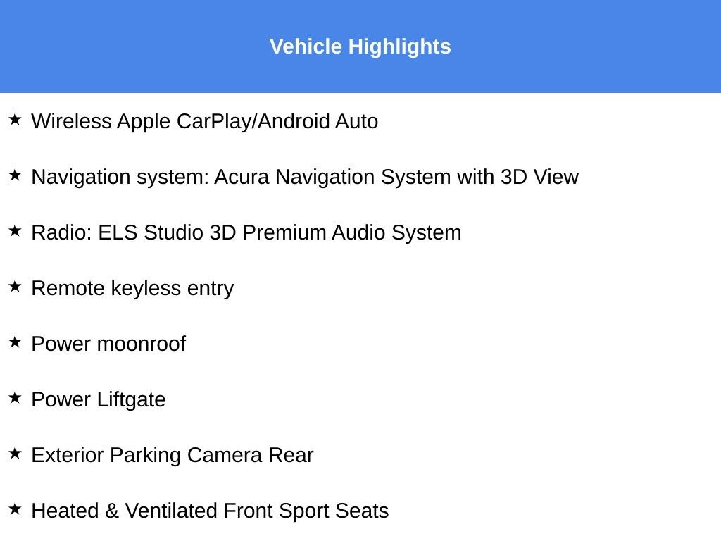 The RDX's sleek and sophisticated exterior is complemented by a spacious and well-appointed interior, featuring premium materials and cutting-edge technology. The Acura Navigation System with 3D View provides turn-by-turn directions, while the ELS Studio 3D Premium Audio System delivers a concert-hall-like listening experience. The Heated and Ventilated Front Sport Seats ensure maximum comfort, while the Power Moonroof and Power Liftgate add to the vehicle's convenience and versatility.