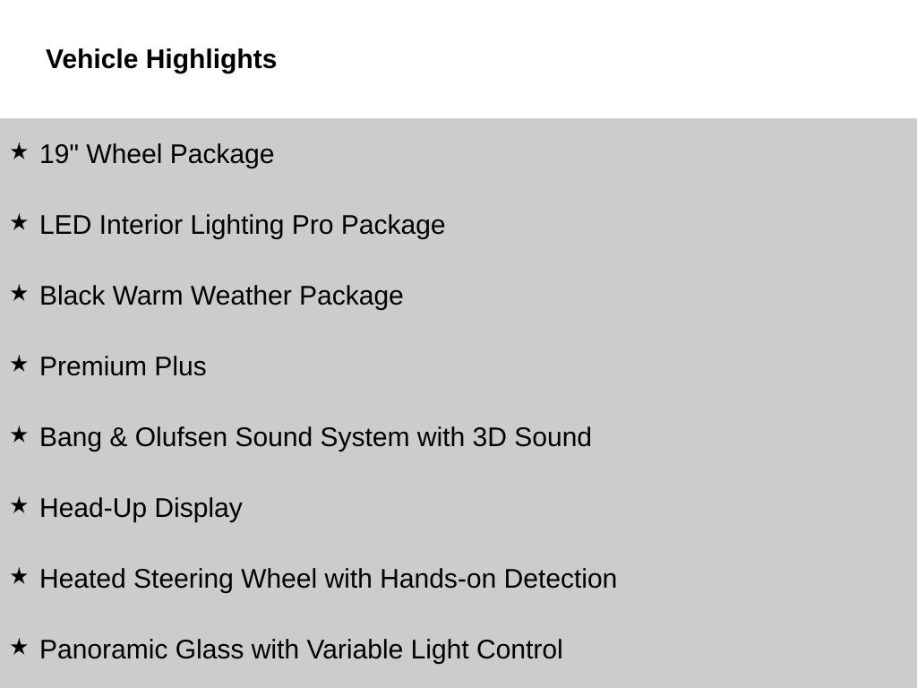 - Premium Plus Package featuring LED Headlights Plus, Head-Up Display, Adaptive Cruise Assist, Bang & Olufsen 3D Sound System, and much more