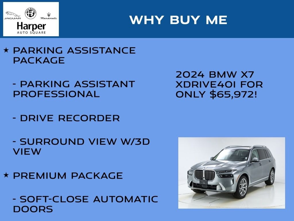 Elevate your daily commute and weekend adventures with this exceptional 2024 BMW X7 xDrive40i. Meticulously maintained and backed by a rigorous safety inspection, this vehicle is ready to provide you with years of reliable and enjoyable ownership. Experience the difference that BMW quality and craftsmanship can make. Visit our showroom today and let us demonstrate how this remarkable SUV can enhance your driving lifestyle.